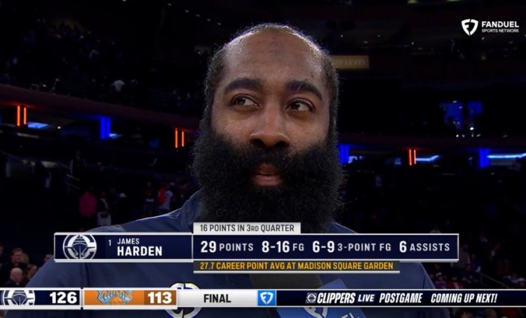 此役过后,哈登生涯在麦迪逊广场花园比赛的场均得分来到27.7分。