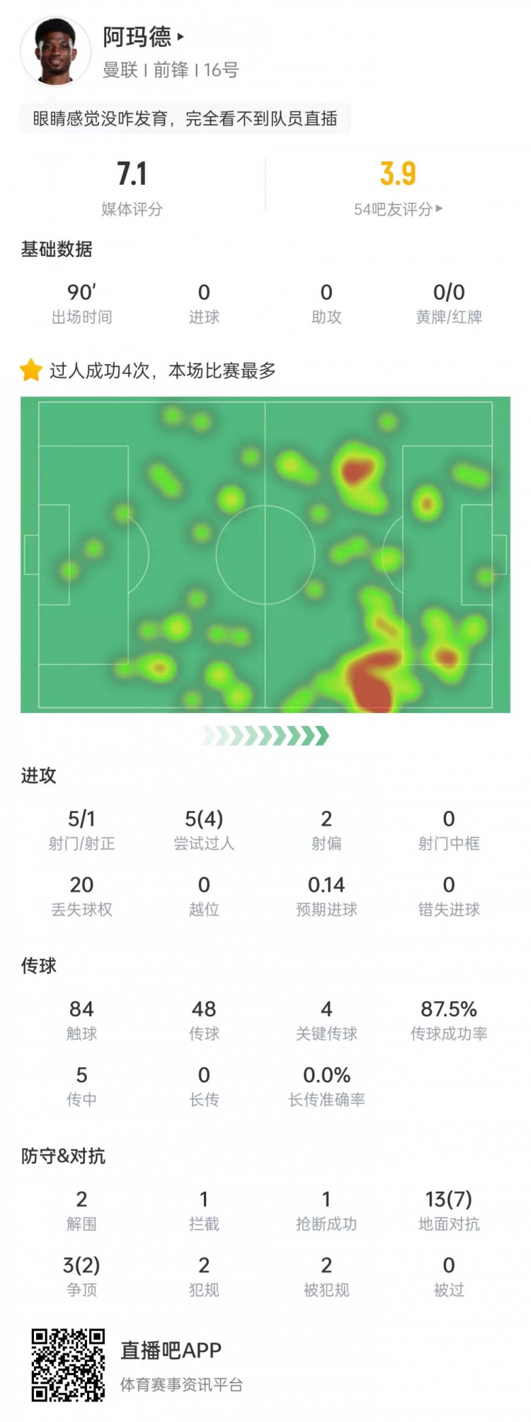 阿玛德本场数据:4次过人成功全场最多,4次关键传球,获评7.1分